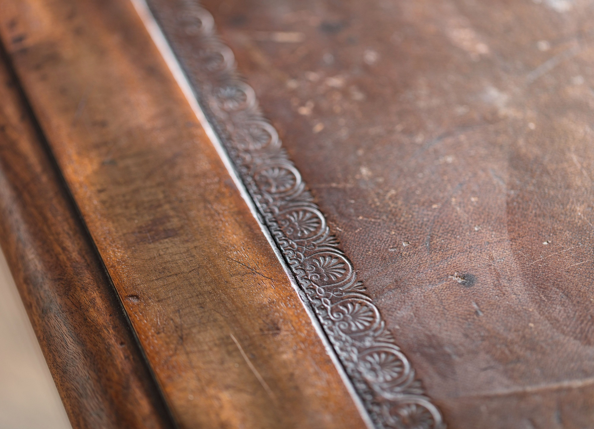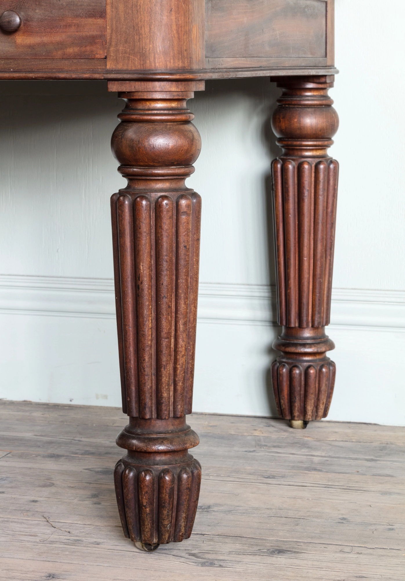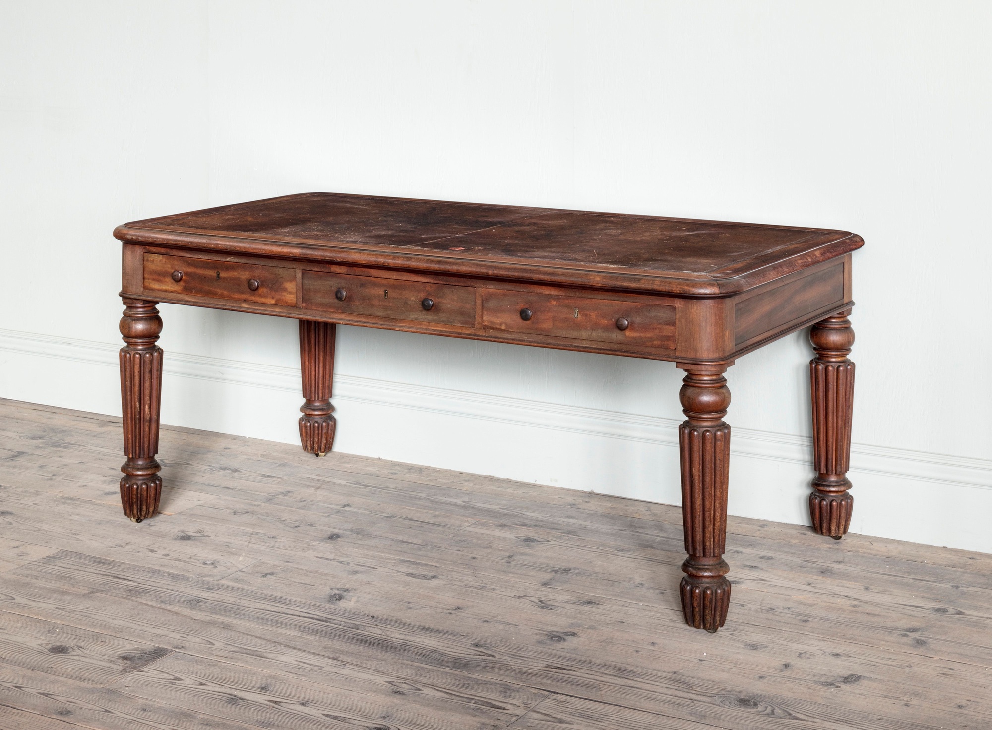 With leather inset top and six drawers, on carved reeded legs with original inset brass casters. The boldly drawn leg of this table bears striking resemblance to the dining table situated in the saloon at Blenheim Palace.