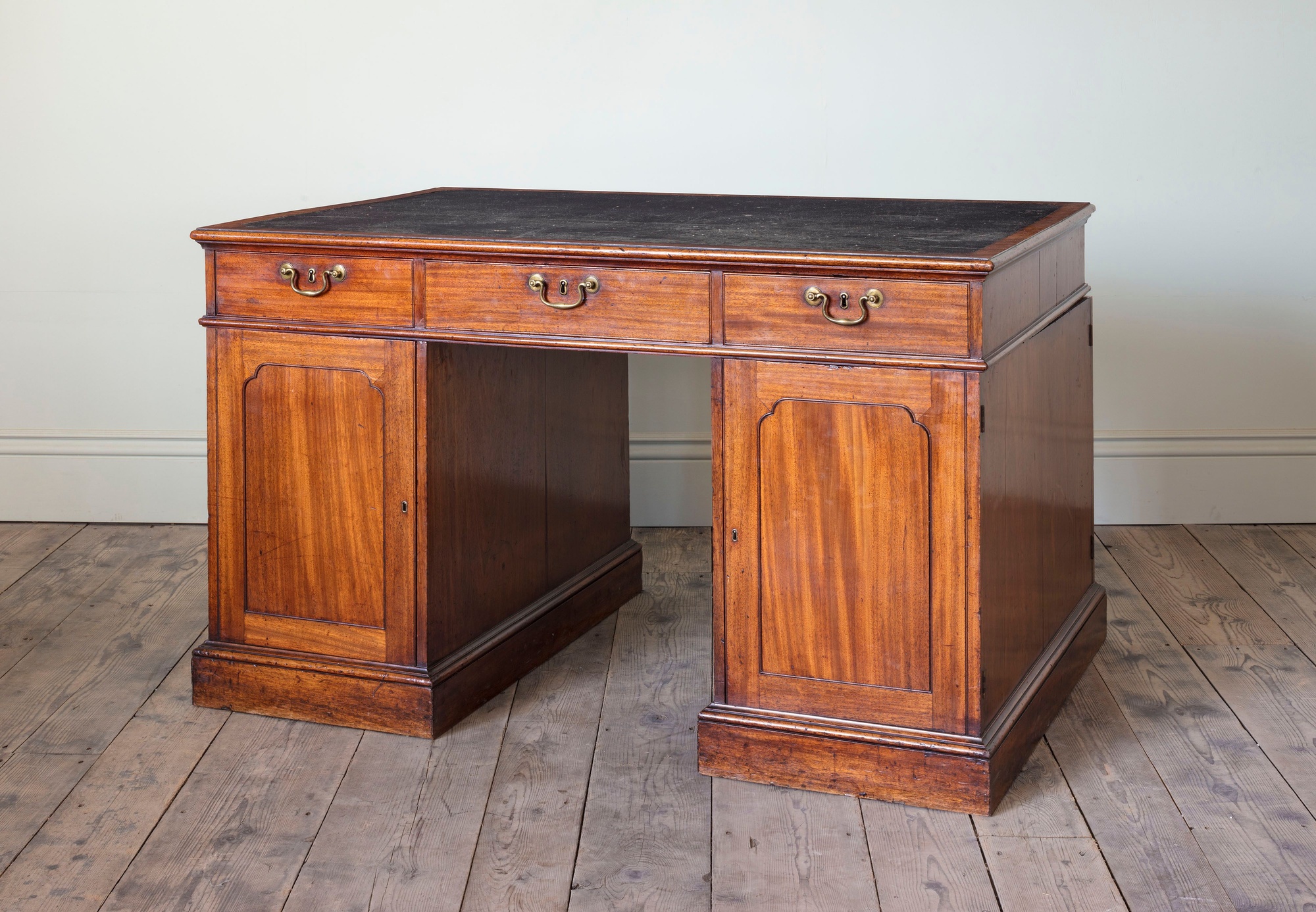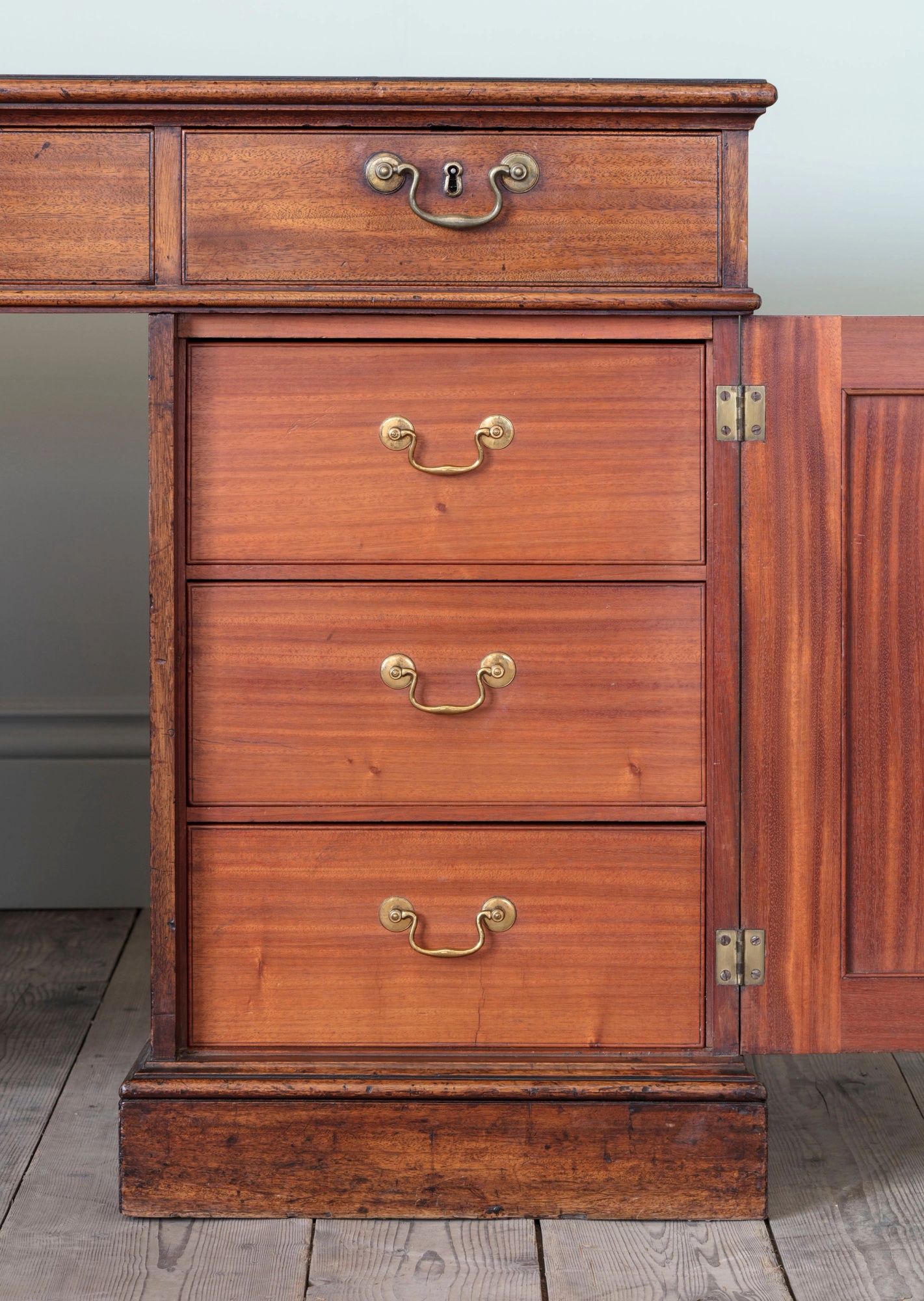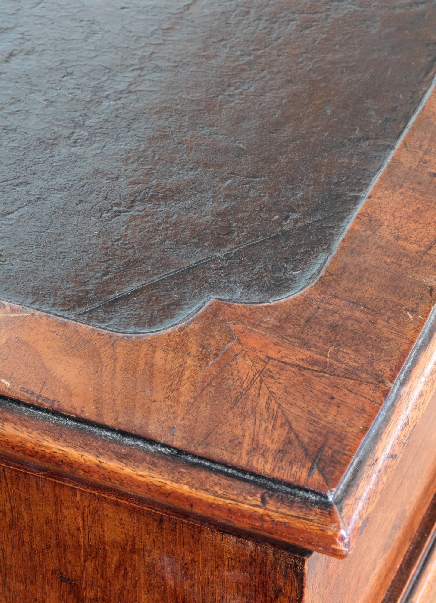 With tooled black leather inset top above six frieze drawers, above opposing cupboards enclosing further drawers.English c.1770