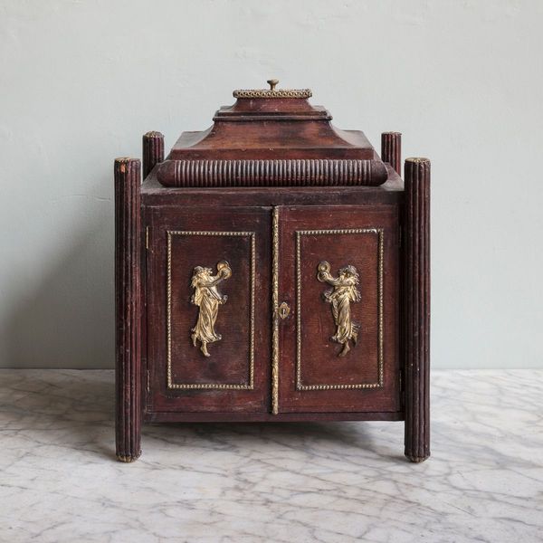 Of miniature cabinet form, covered with original red Morocco leather, with an extensive selection of drawers, compartments, slopes, and hinged mirrored top, with four surrounding reeded columns and gilt ormolu figurative mounts and flanking handles.