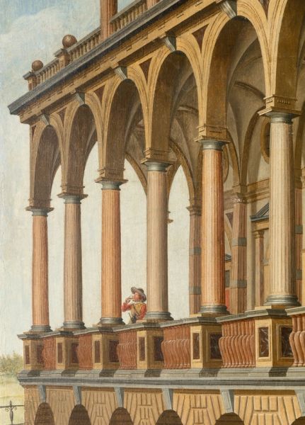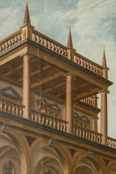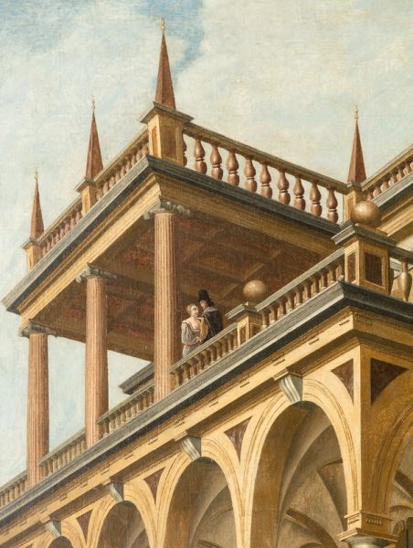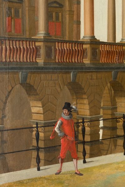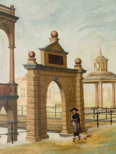 Of substantial scale, and intricate perspective, this depiction of a palatial, colonnaded edifice reflects the fashion, among Northern European painters of the 16th and 17th centuries, for depicting elaborate capriccios, incorporating classical and baroque elements.