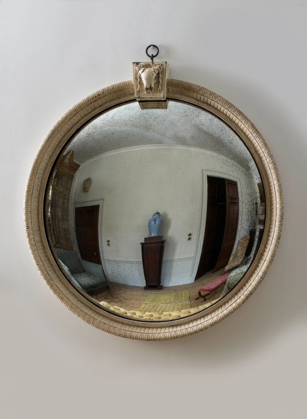 This circular mirror frame has a distinctive ‘bucranium’ or ox skull cresting. The bucranium motif originated through the practice of adorning Roman temples with sacrificial oxen and garlanding them with fruit and flowers. It subsequently became a key motif of the Doric order of architecture and later the Neoclassical revival of the 1770’s.