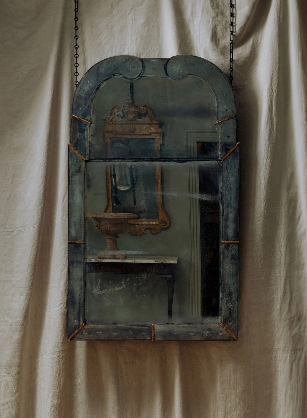 Based on an early English Queen Anne pier mirror, with a broader form incorporating shaped, silvered and bevelled plates with lightly etched decoration to the top marginal sections, divided by decorated gilt paper fillets. The lower section with outer giltwood frame enclosing two central-shaped, bevelled, and lightly aged or ‘foxed’ split plates.