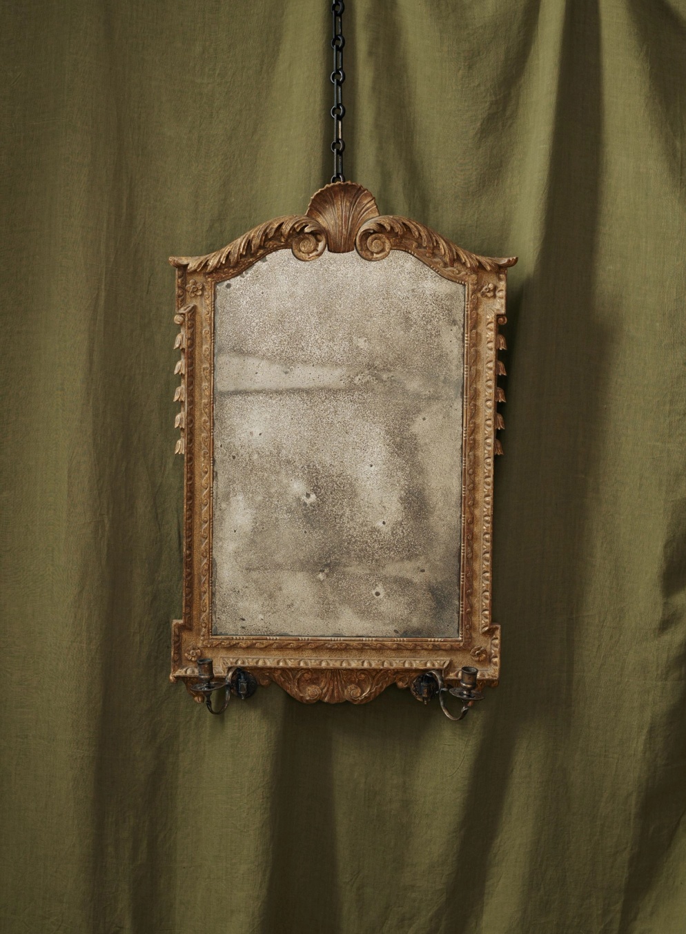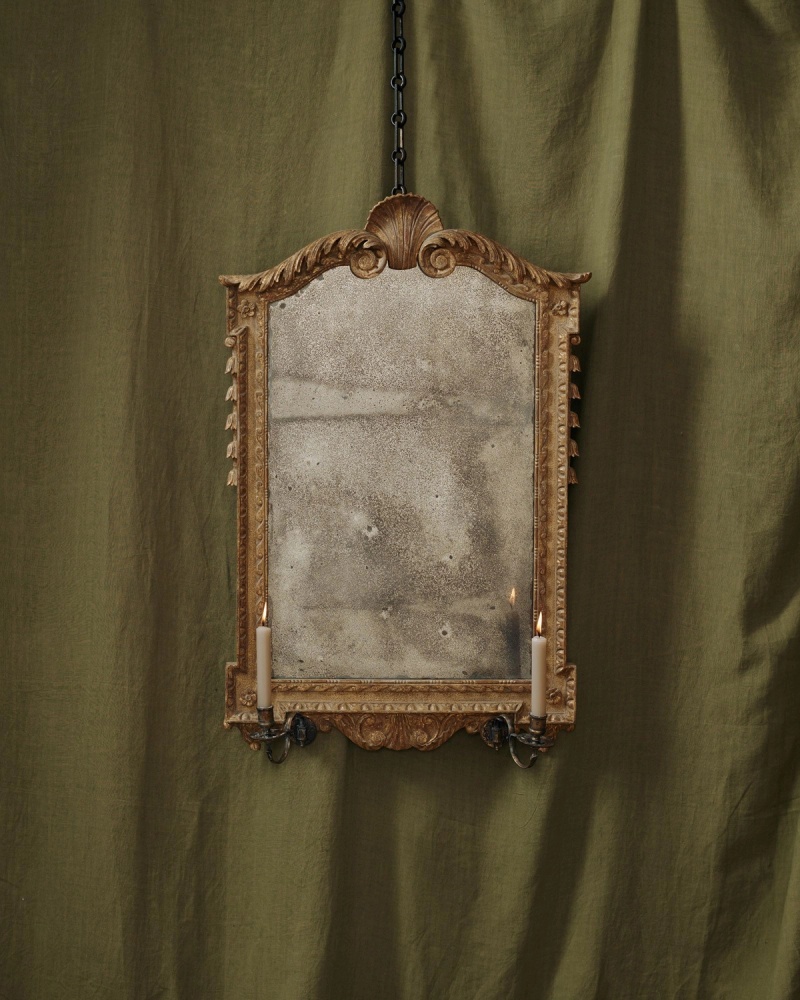 Reproduced faithfully from a highly renowned mid 18th century design by Benjamin Goodison (royal cabinetmaker to George II) the frame is centred by a shell cresting, scroll and acanthus carved cartouche above an egg and dart mounted ‘re-entrant’ form, with a meticulously aged and subtly ‘foxed’ mirror plate. Here photograph in a gently antiqued giltwood surface finish, aiming to replicate the original 18th century ‘untouched’ lustre. The mirror has a pair swan neck scrolling brass candle sconces (removable), to hold wax candles, if desired.