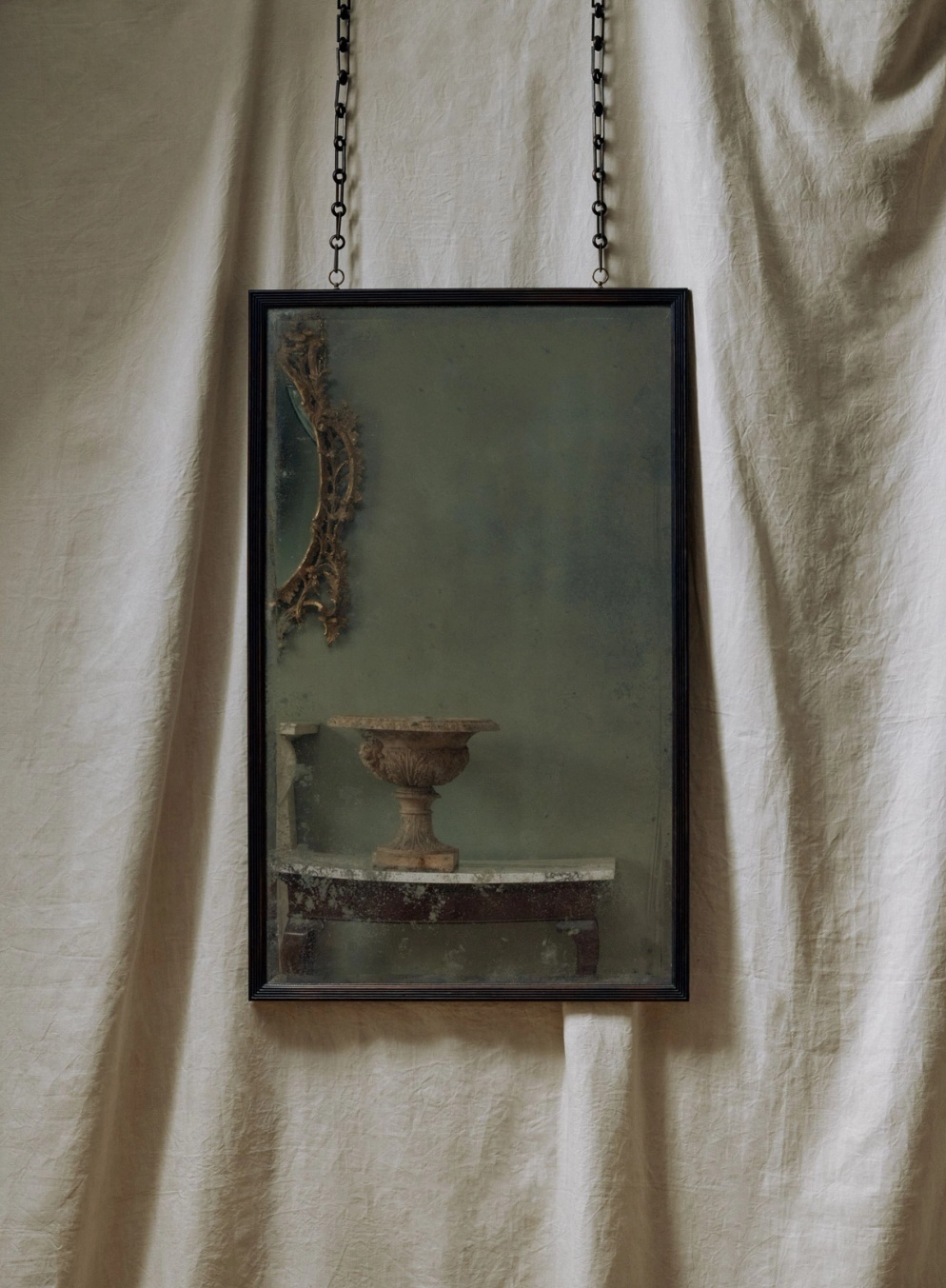 A versatile frame, with lightly reeded ebonised surface, enclosing a gently aged mirror plate with bevelled edges, lending itself extremely well to bespoke sizing.