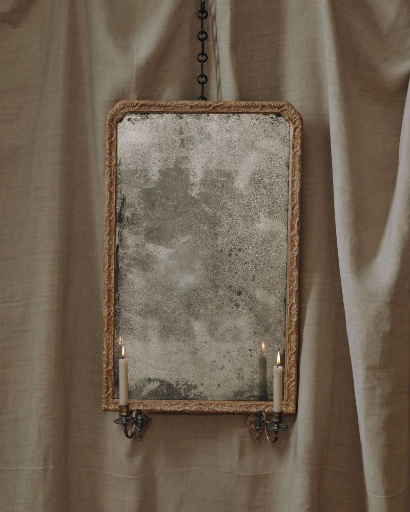 Here shown with a sensitively aged mirror plate, with softly bevelled glass edges, and a pair of swan neck scrolling brass candle sconces (removable), to hold wax candles, if desired.