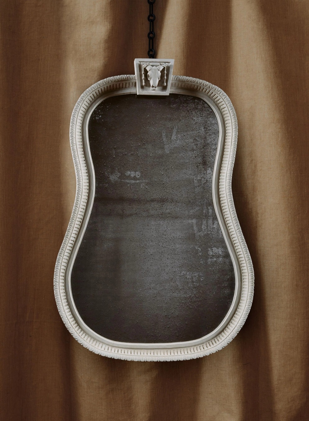 This waist-shaped mirror frame has a distinctive ‘bucranium’ or ox skull cresting. The bucranium motif originated through the practice of adorning Roman temples with sacrificial oxen and garlanding them with fruit and flowers. It subsequently became a key motif of the Doric order of architecture and later the Neoclassical revival of the 1770's.