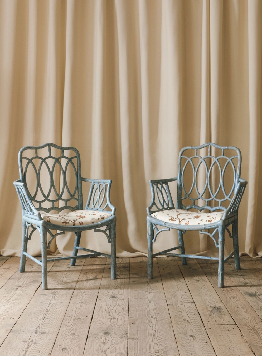 A reproduction of a striking Regency original, comparables of which can be seen in the collection of Queen Elizabeth, the Queen mother, and formerly at Royal Lodge, with ten in total in the Royal Collection today. With a drop in seat, and faux-bamboo legs, arms and back, this striking chair evokes that exotic enclave and retreat from harsh English weather: the orangery.