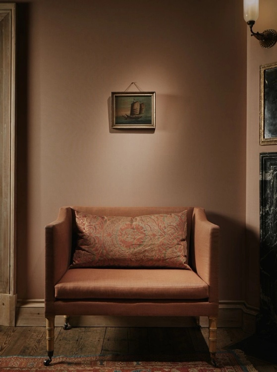 The generous, robustly drawn proportions of the Kitty chair are accentuated through the strict, 18th century style upholstery and horsehair squab cushion. Standing on four turned and tapering faux bamboo legs on brass castors, the distressed patina aims to replicate the stone/saffron-hued 18th Century paint of an original Georgian open armchair, from which this design was faithfully reproduced.