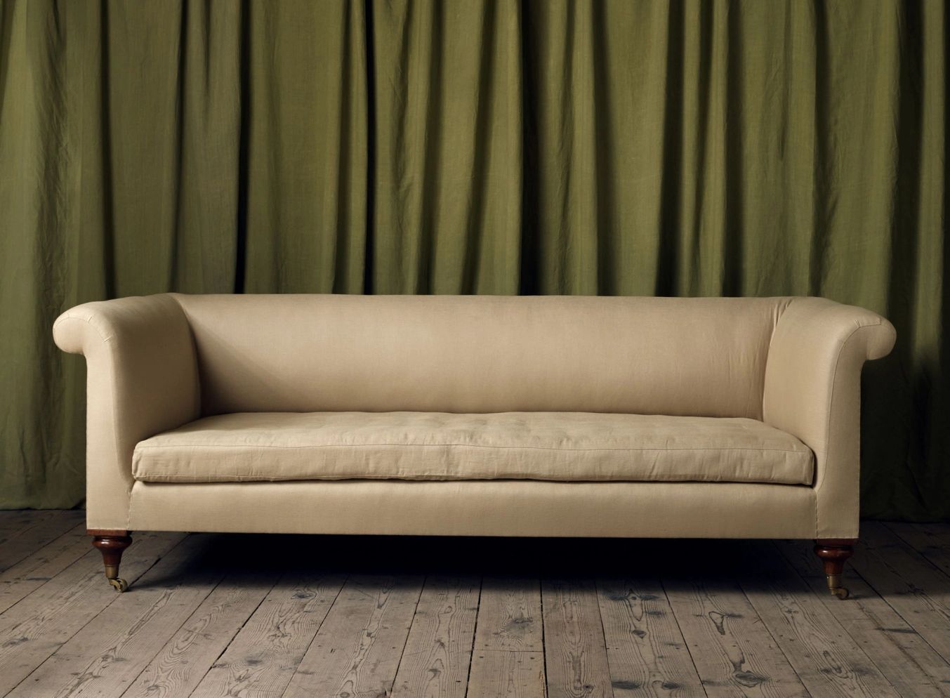 The Crawford sofa, photographed here with a gently fitting and box pleated loose cover, is faithfully reproduced from an original pair of 19th century sofas, formerly in the collection of The Earl of Crawford at Haigh Hall. Beneath the loose cover (photographed below) is a tightly upholstered frame with high square arms and back, on robustly turned mahogany legs and brass casters.