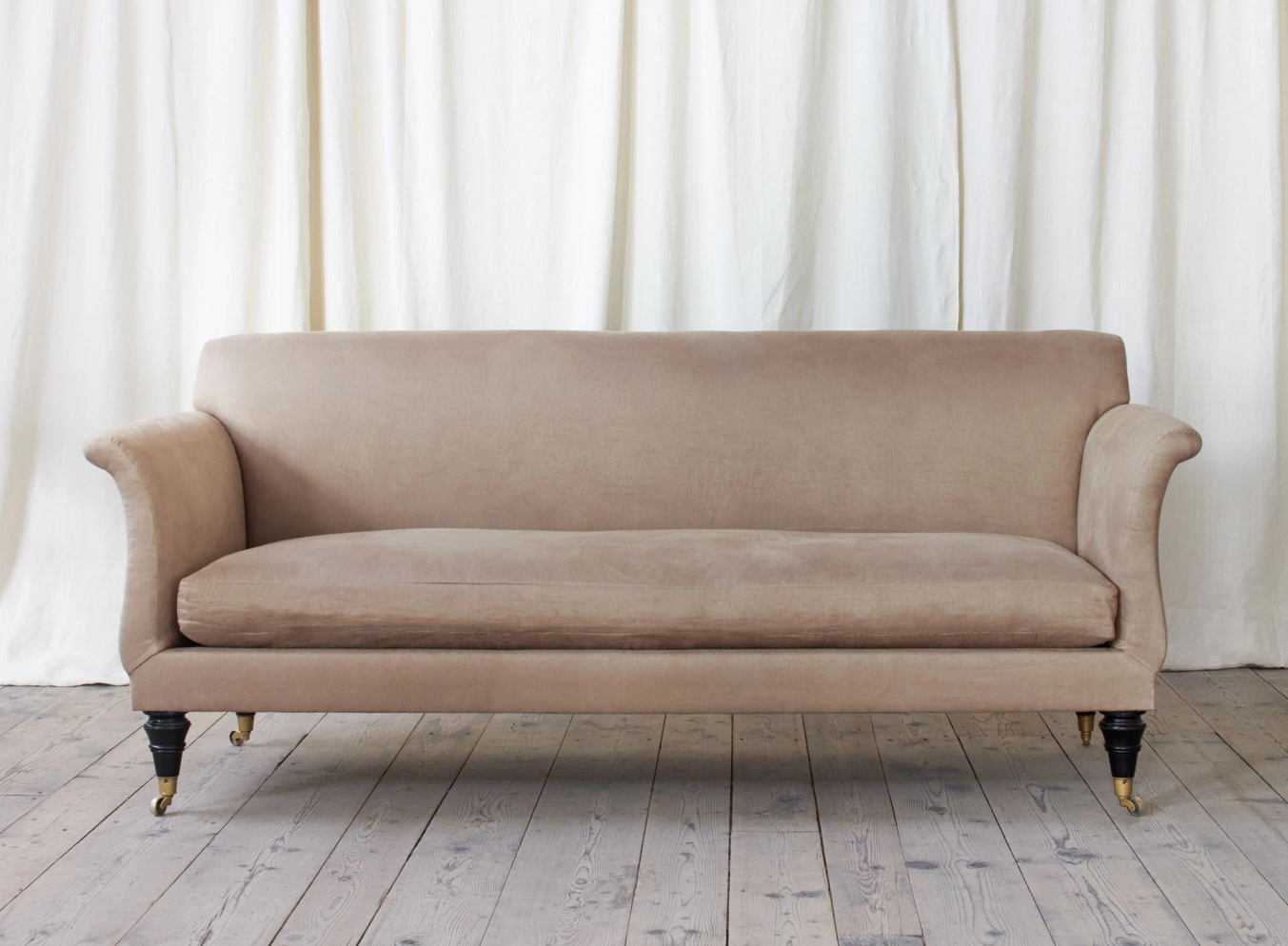 A Regency style mahogany sofa. The high-back and S-shaped arms above a rectangular seat with squab cushion on turned and reeded tapering legs. Reproduction of an 1810–1820 original.