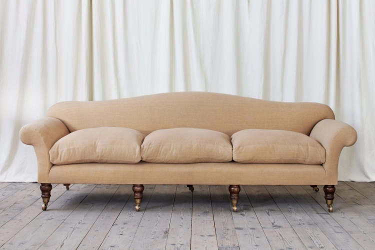 The design of this handsome and overscale sofa is taken from a 19th century English country house model, favoured for its sculptural camelback and generous seat depth, resting on four robustly turned front legs. Incorporating substantially cast brass casters (following the lost wax process, and copied faithfully from an original), this sofa has all the comfort of the synonymous Howard and Sons siege de duvet feather and down style of upholstery, whilst retaining clarity and a stricter line around the scrolling arms and sweeping back. Photographed with both tight upholstery, and a removable loose cover with wide box pleats, which can be specified if required.