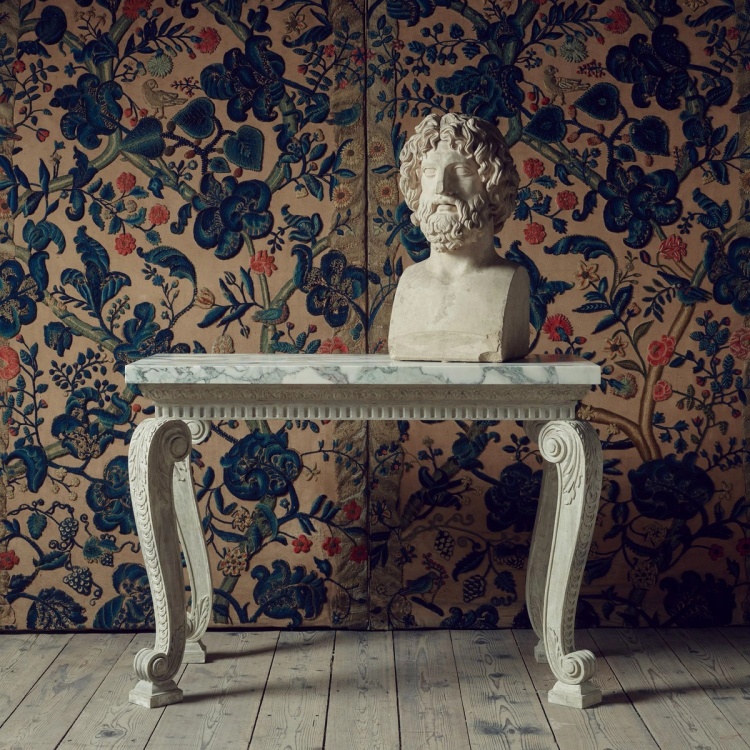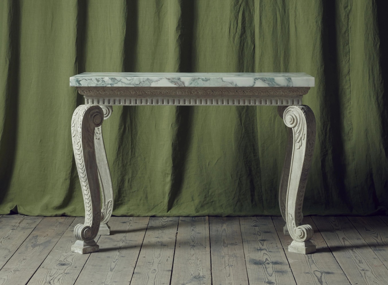 This well drawn and handsomely scaled white painted console table, with shaped volute cabriole legs carved with acanthus leaf and imbricated circle carvings on stepped chamfered feet, is taken from an 18th century original walnut model (c.1735) currently in the Royal Collection and attributed to Benjamin Goodison (cabinetmaker to King George II).