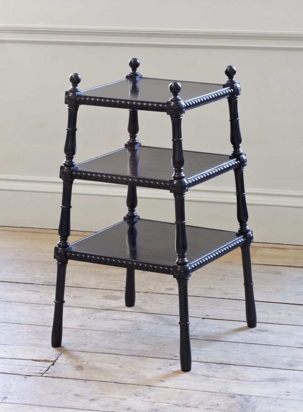 An ebonised, three-tier whatnot with ball finials, carved bobbins and bullseyes. The keen lustre of the ebonised surface lends this otherwise playful table a considered, grown-up presence. Each leg is turned inwards, sophisticated cabinetry work required to join the cube corners with the tiers.
