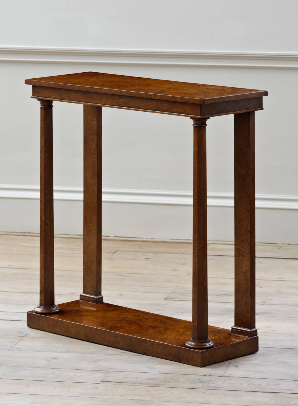 A pollard oak console table in the late Regency tradition. The rectangular top with squared edge above a conforming frieze, the octagonal tapered front legs with ring turned, moulded collars and with squared back supports untied by a platform stretcher.The elegant simplicity of this small console table reflects the early designs of Thomas King published in The Modern Style of Cabinet Work Exemplified, first published in 1835.Pollard oak is found at, or near the base of some trees as well as from naturally diseased timbers. It also occurs when trees are pollarded, or cut back on a regular basis; the cutting produces the distinctive markings.