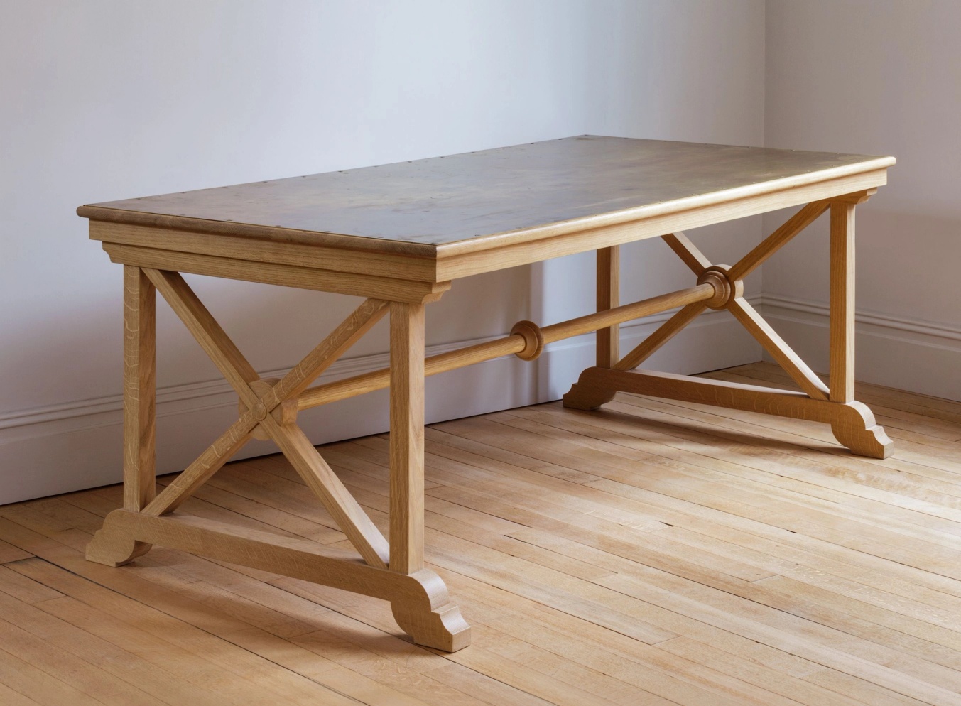 An Arts and Crafts style table made from the highest quality English oak, shown with a sheet brass top, above square legs and X-frame supports, united by a turned stretcher.