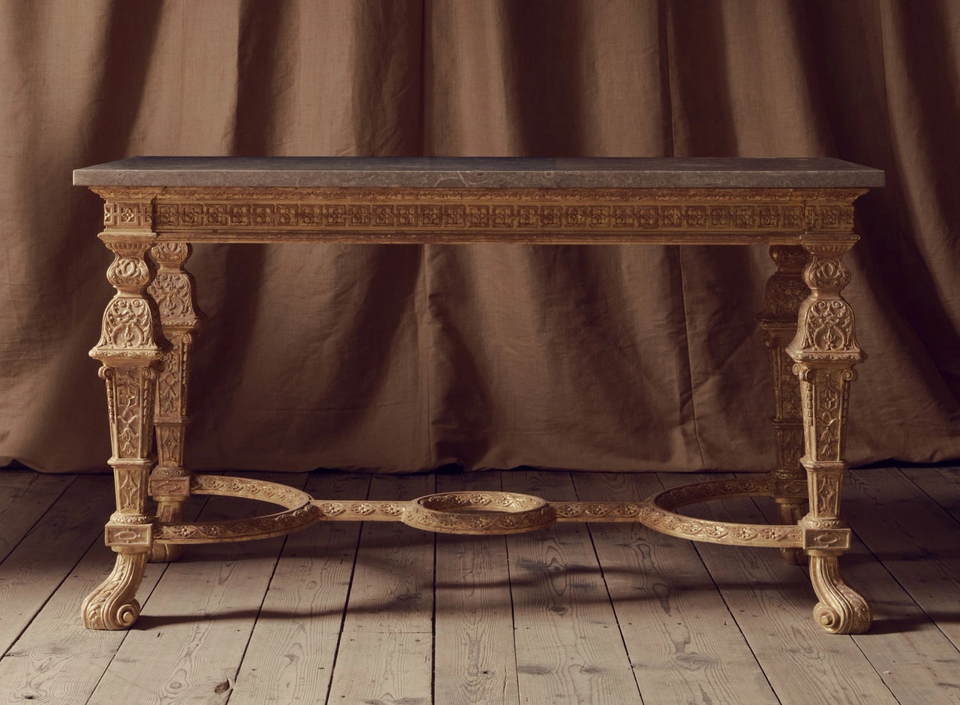 Modelled on an early eighteenth century giltwood and gesso pier or console table, attributed to James Moore (c.1715) and present in the apartments of King George IV at Windsor Castle. Shown here with a slab Derbyshire Fossil marble top (with extensive fossil markings, mined from the Chatsworth Estate), with generous and thinly cut overhang typical of early period tables. With square baluster tapering legs with volute feet, joined by a stretcher carved into semi-circular strapwork at each end connected by a central carved circle. The original table appears in For the King’s Pleasure (Hugh Roberts, 2001, p. 264), and this lustreful yet sober finish to the giltwood surface aims to emulate the untouched gilded surface of the 18th century original.