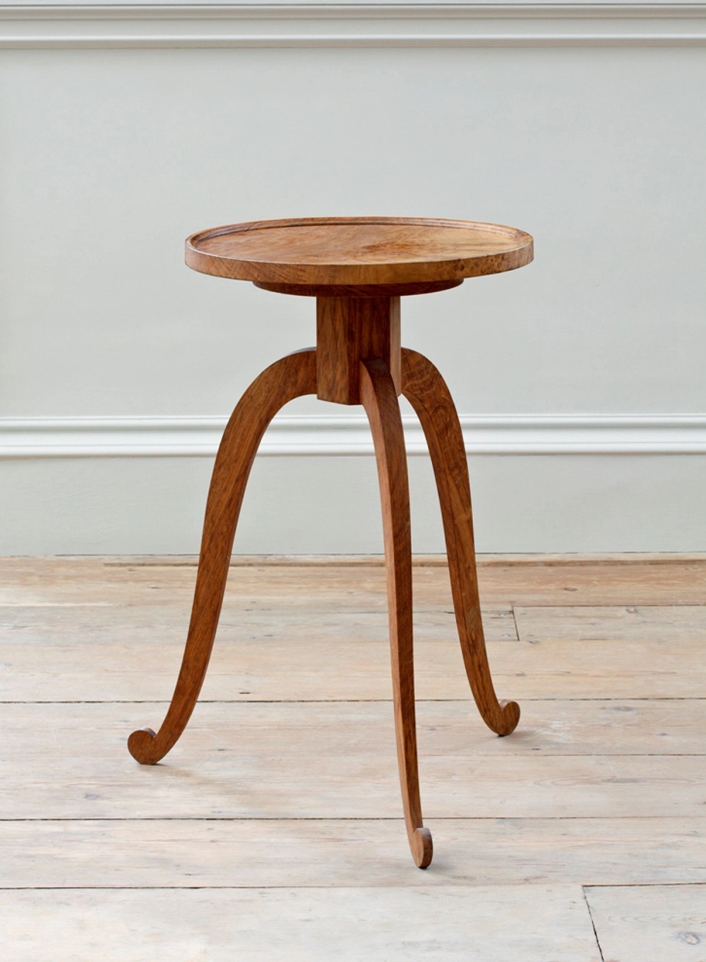 This elegant brown oak tripod table with moulded circular top on an overscrolled tripod base is in the manner of Jacques-Emile Ruhlmann (1879–1933) and shows his preference for the simplest forms. Ruhlmann was the leading Parisian furniture designer of his time and with his partner, M. Laurent, they produced what is probably the best made and certainly the most expensive furniture of the time.