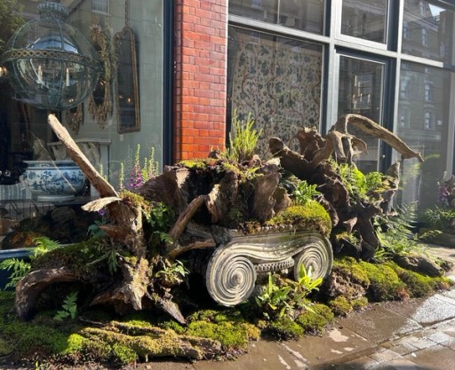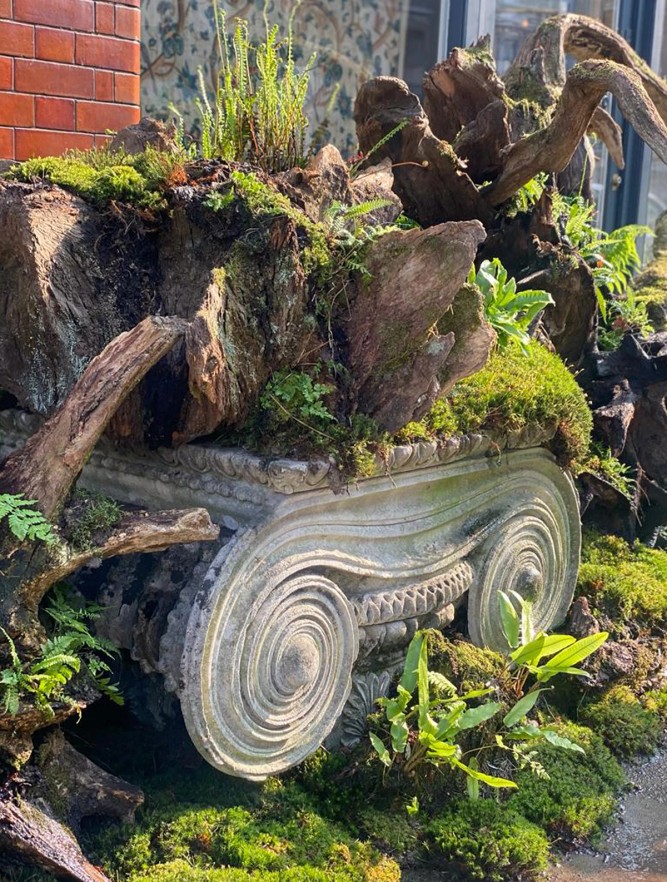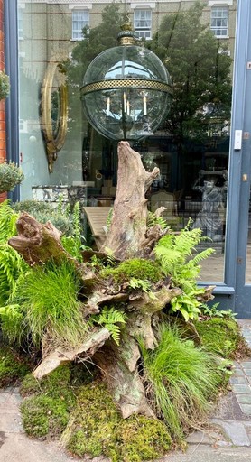 Mat Reese, head garden designer at Malverleys estate, and Aaron Bertelsen dressed the front of the Jamb Showroom on Pimlico road this year with a monumental Stumpery made of ancient Oaks and adorned with ferns, moss, foxgloves, Alpine Strawberry and some Wood sorrel, reminiscent of the Victorian era. Then we wanted the eye to travel into our showroom, where we have placed a splendid sundial, in the form of the mythological personification of time Chronos, in the shop's entrance.