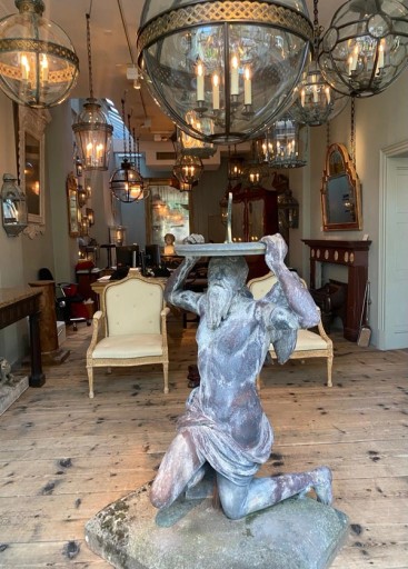 We then wanted the eye to travel into our showroom where we have placed a splendid sundial, in the form of the mythological personification of time Chronos, in the entrance of the shop.