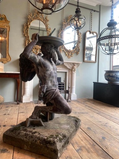 There is a humanity of poise kneeling and bearing an elegantly wrought sundial and gnomon signed ‘B. Martin’ this figurative and highly metaphorical piece was commissioned for Flaxley Abbey, a former Cistercian Monastery, by Sir Thomas Crawley-Boevey (1709-69), from the workshop of John Cheere at the height of his output (1709-87) (brother of Sir Henry Cheere) after a design by renowned lead statuarist John Van Nost (d. 1729).