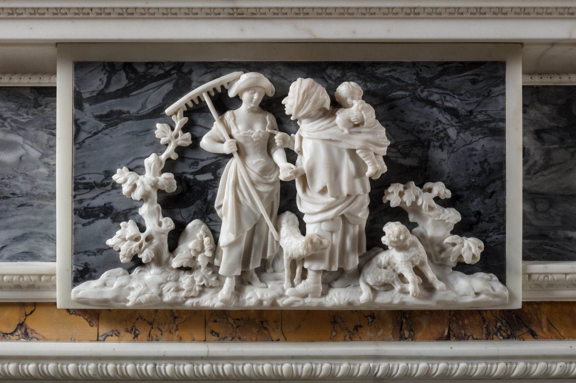 In 18th century England — a period defined by the dominance of Palladianism and classical themes drawn from Greek and Roman mythology — a playful subject such as the fortune teller might appear out of place. This bucolic subject, carved onto a neo-Palladian chimneypiece, conveys a sense of graceful rusticity, moving away from the austerity of mythological narratives.