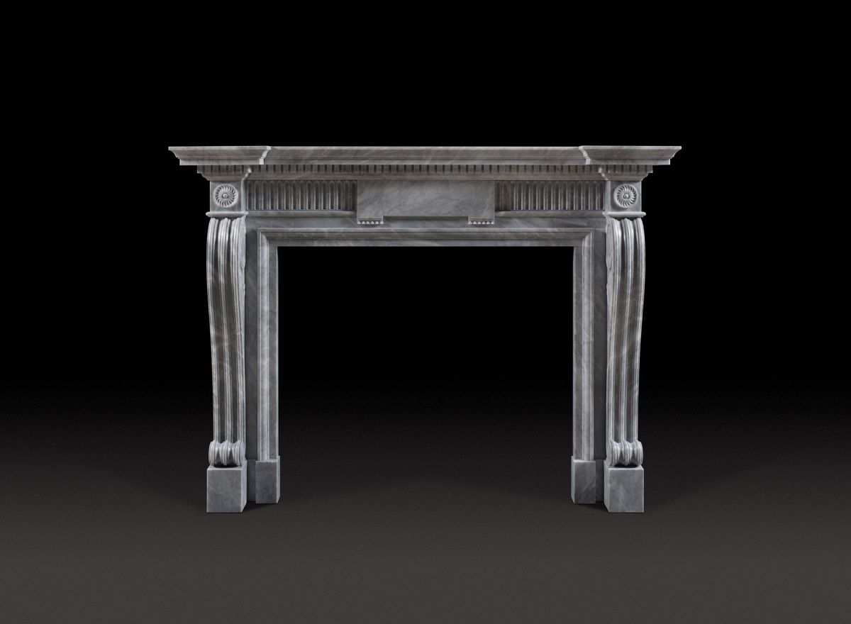 A modern opulence and confidence of line is expressed through the Walker. Carved in Grey Breche marble, the grooves that run along each side of the chimneypiece create continuity between the header and the jambs. The graduated aperture, like a geometric cave, is set beneath a header of monumental proportions.