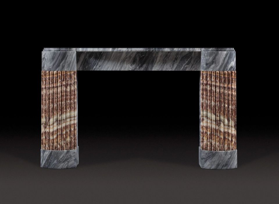 This design from the 1930s revisits classical architectural canons through the lens of the new machine age. Carved in Bardiglio and Red Onyx marble, the shelf is strikingly lean in comparison to the mighty jambs, reminiscent of pilasters. Each jamb is reeded, carved in book-matched, flame red Onyx.