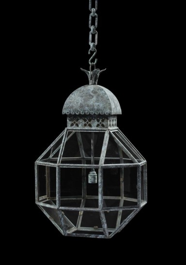 This elegant lantern has taken much of its design from the Arts and Crafts aesthetic movement. The cupola top pierced and crowned by a foliate decorated hook above a multisided glazed body.