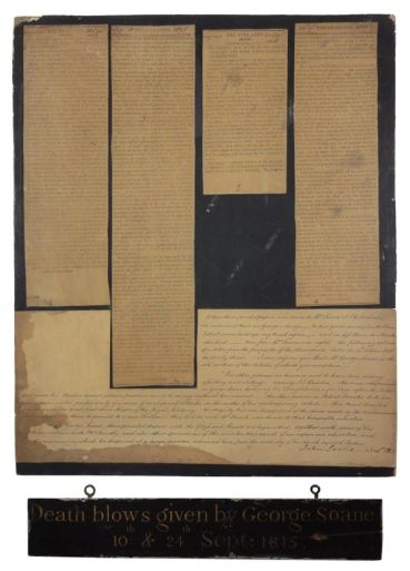 Soane lived without her for a further twenty two years. Her bedroom lay intact for nineteen years and he instructed that her place always be laid at the table. He framed the ‘Death Blows’ articles of 16th and 24th September 1815, and hung it with a plaque. Every day a reminder.