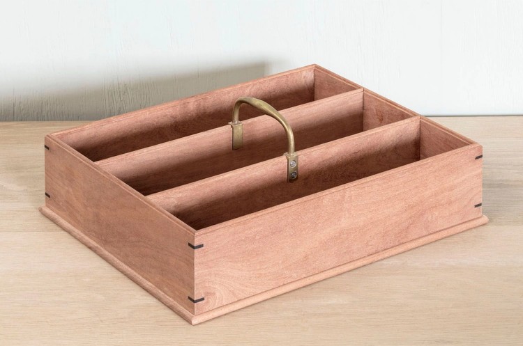 The last addition that collates a total collection of five hand crafted pieces is a hand constructed cutlery tray in raw mahogany with brass handle and inlaid ebony corners, based on an 18th Century original.