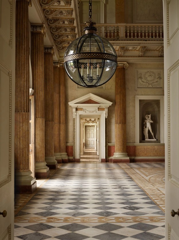 The hall has the most lavish of marble floors, set in a double-height entrance surrounded by four colonnades of Sienna columns supporting balconies. It must be one of the finest and glamorous Palladian entrances ever conceived.
