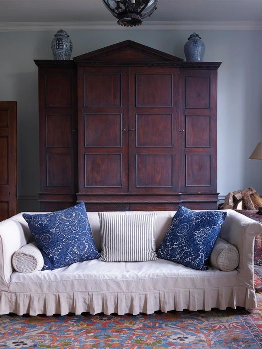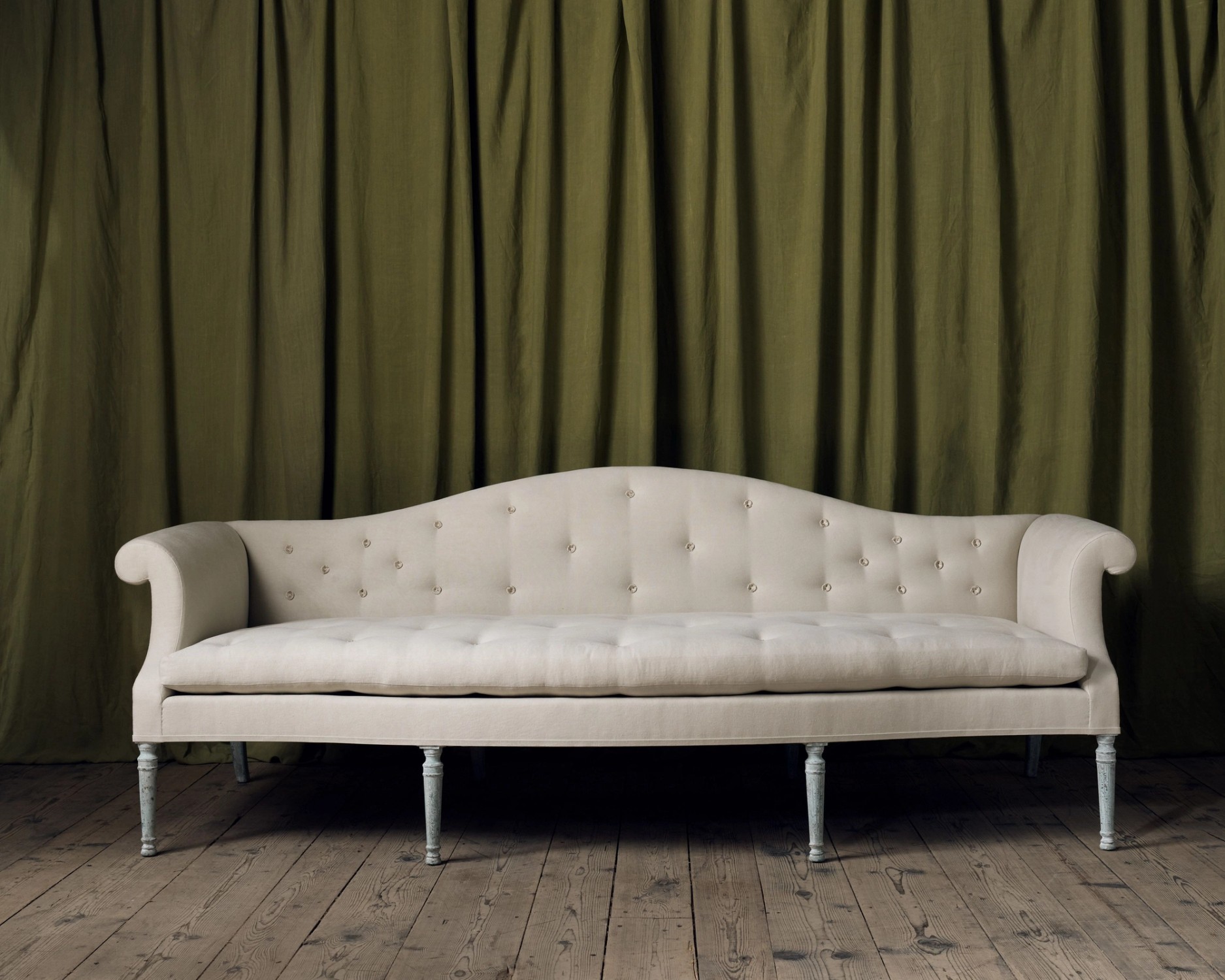 Another sofa joins the fleet of exquisite settees, that we have named the Hardwicke. Once again this was inspired from an antique I bought whose design was too good to remain solely as one. The Hardwicke is reproduced faithfully from an original extremely elegant George III country house sofa, with it’s gently shaped camel back, serpentine front rail and deep seat. It was important to me to replicate as closely as possible, the original 18th century paint surface and the chalky blue painted legs encapsulate perfectly the sensitively aged patina. I love the juxtaposition of this, with the tight, buttoned upholstery in the Hepplewhite style, which evokes the faded grandeur of the great drawing rooms of the 18th century English estate.