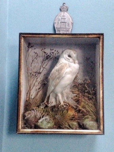 This is my homage to Derbyshire, where my Mother’s family have farmed for many generations. My grandparents’ house and the countryside around were my favourite place to be when we were younger, and it’s a place that my family have great affection for. Over the years, Will has continued to fuel my interest in taxidermy. When I found this Edwardian owl in an antique shop near the family homestead, with the label of a Derby taxidermist, I bought it because of its local associations. It evokes a memory of watching the majestic flight of these owls over the fields of my grandparent’s farm at dusk. The early 19th-century lead insurance plaque (proof to the fire brigade that you had insurance against fire) came from one of the barns there.