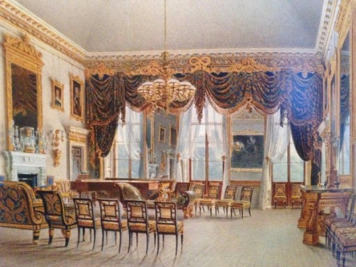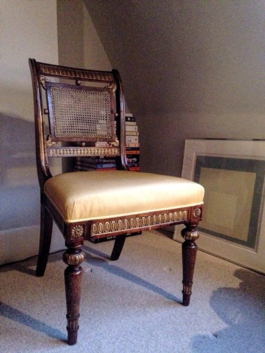 I found this Regency kingwood veneer chair by pure chance. I was looking for furniture when I was doing up a flat years ago and scouring the sale rooms. At the time, work at Sotheby’s had taken me to Chatsworth House, and I realised that a chair in a sale coming up at Bonham’s was identical to a set of furniture that was in the library there. I did some research and found this watercolour by William Henry Hunt of the sixth Duke of Devonshire’s brand spanking new update of the Saloon at Devonshire House in London circa 1820 which showed a larger set of these chairs than survives at Chatsworth.