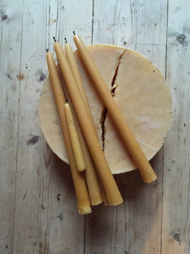 Last night we cooked by candlelight as there was no electricity. Even though we set fire to the shelf, it was the most beautiful experience! Can you imagine what it was like in the days before electricity, when everything was lit by candles, The quality of light cannot be compared – it is so calming and makes you slow down. Candlelight is a luxury especially if they are beeswax candles as they cleanse the air. My father is a beekeeper and he gave us this mound of beeswax which we want to make candles out of. We buy beeswax candles direct from small producers whenever we come across them, and these ones are from Berlin.