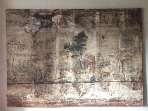 We found this painting four years ago at the Decorative Antiques and Textiles Fair. It is the most expensive and naughtily indulgent purchase we have ever made. The painting would have been part of a fresco panelled room. What is amazing is that the canvas is actually pieces of sacking which have been sewn together. It is a folk scene with the most curious proportions. The dragonfly is the size of a Tiger Moth plane and the Castle is like a little hut next to the tree.