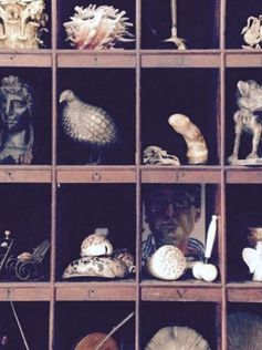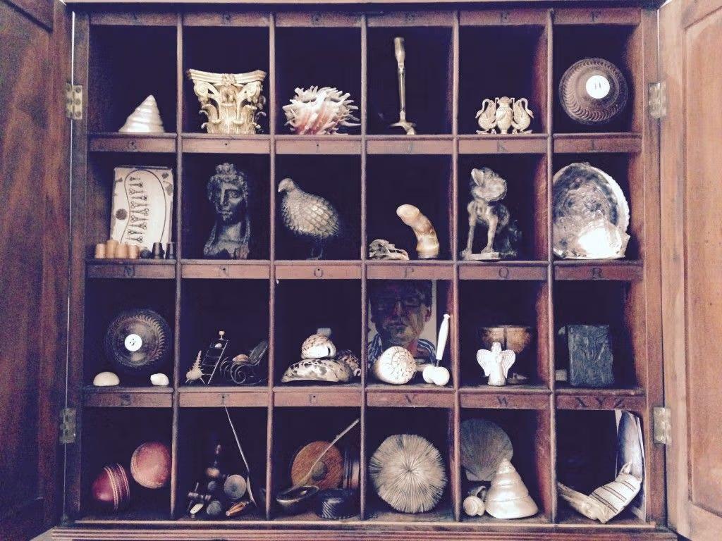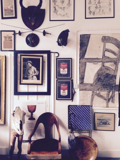 I have to be surrounded by my objects in my office. I couldn’t sit in an empty white room, however beautiful it is. Amongst this conglomeration is a nineteenth-century Japanned tray that I found discarded in a bin bag around the corner from my office. A Regency simulated rosewood spoon back chair, a sycamore trencher and my latest amalgamation of found objects. A beautifully patinated shire horse skull that sits on the legs of a child mannequin. It was an old tradition to bury favourite animals, or parts of them in this case, under the floorboards or flagstones of their owners' houses. I found this old skull in West Sussex. The wax and carbon drawing of the chair and window is one of my creations, and the digital prints are by someone who works here at Christies. A lovely spoof of Warhol’s work.