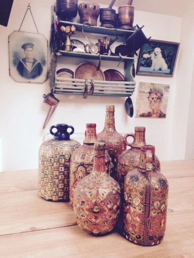 I’ve been collecting these bottles covered in cigar labels and have never worked out exactly what or why they were made. I imagined a bored bar tender or tobacconist in Holland fastidiously retrieving the labels from thousands of cigars and aligning them into a perfect symmetrical arrangement onto these bottles. I love the effort and work involved in the decoupage work.