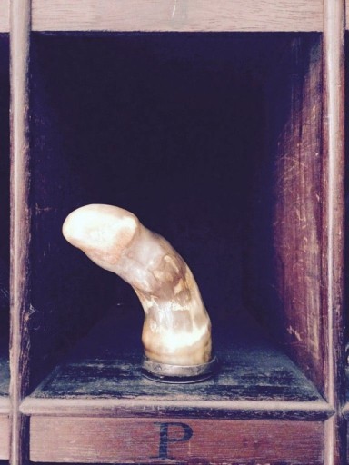 Ladies took snuff as well as gentleman in the past centuries so I find this highly amusing. Usually the snuff boxes are the typical spiral rams horn shape, so this is very unusual and unique. It is a very old example, probably late eighteenth century, beautifully made with a silver plated cover.