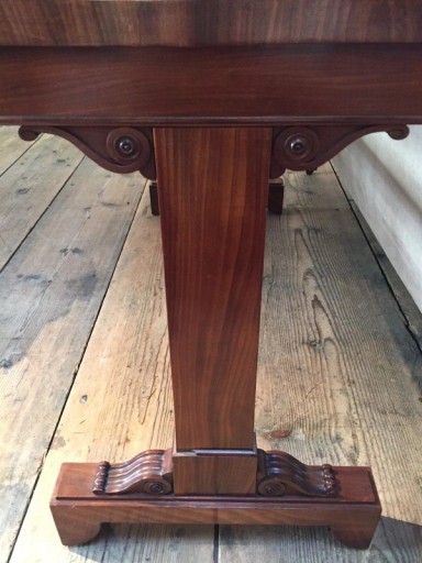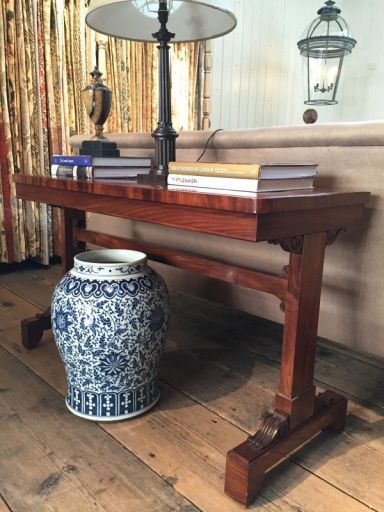 I was recently researching through old catalogues and came across the same table in an old Christies catalogue from 1984. It read “ A regency writing table with moulded rectangular top on solid trestle ends joined by a plain stretcher scrolling and shaped feet”.
