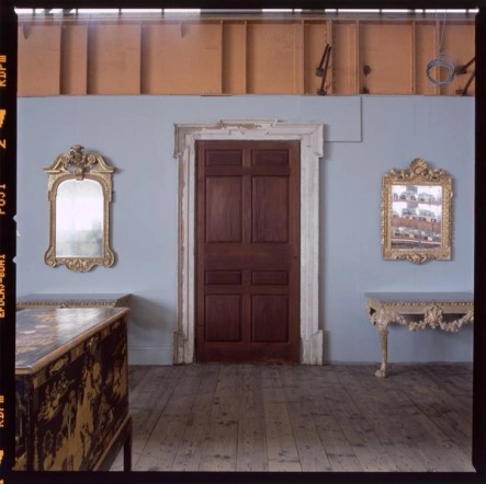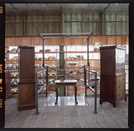 Sitting on a lift used to move furniture up to the mezzanine, a carved-mahogany George II side table is flanked by a George II mirrored cabinet (left)and an early George III burr-yew chest on chest, (right).