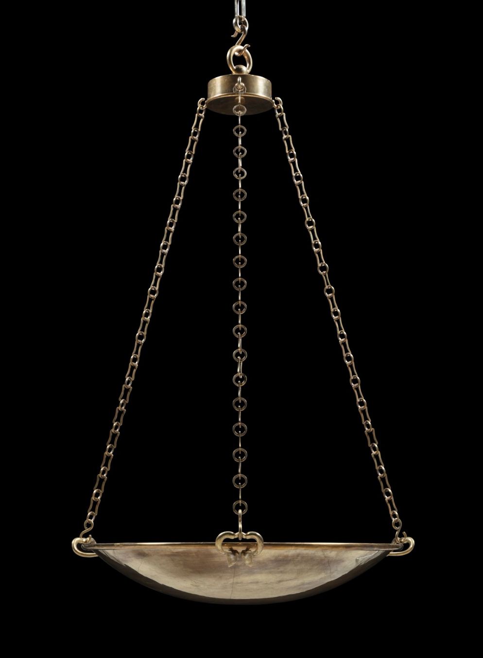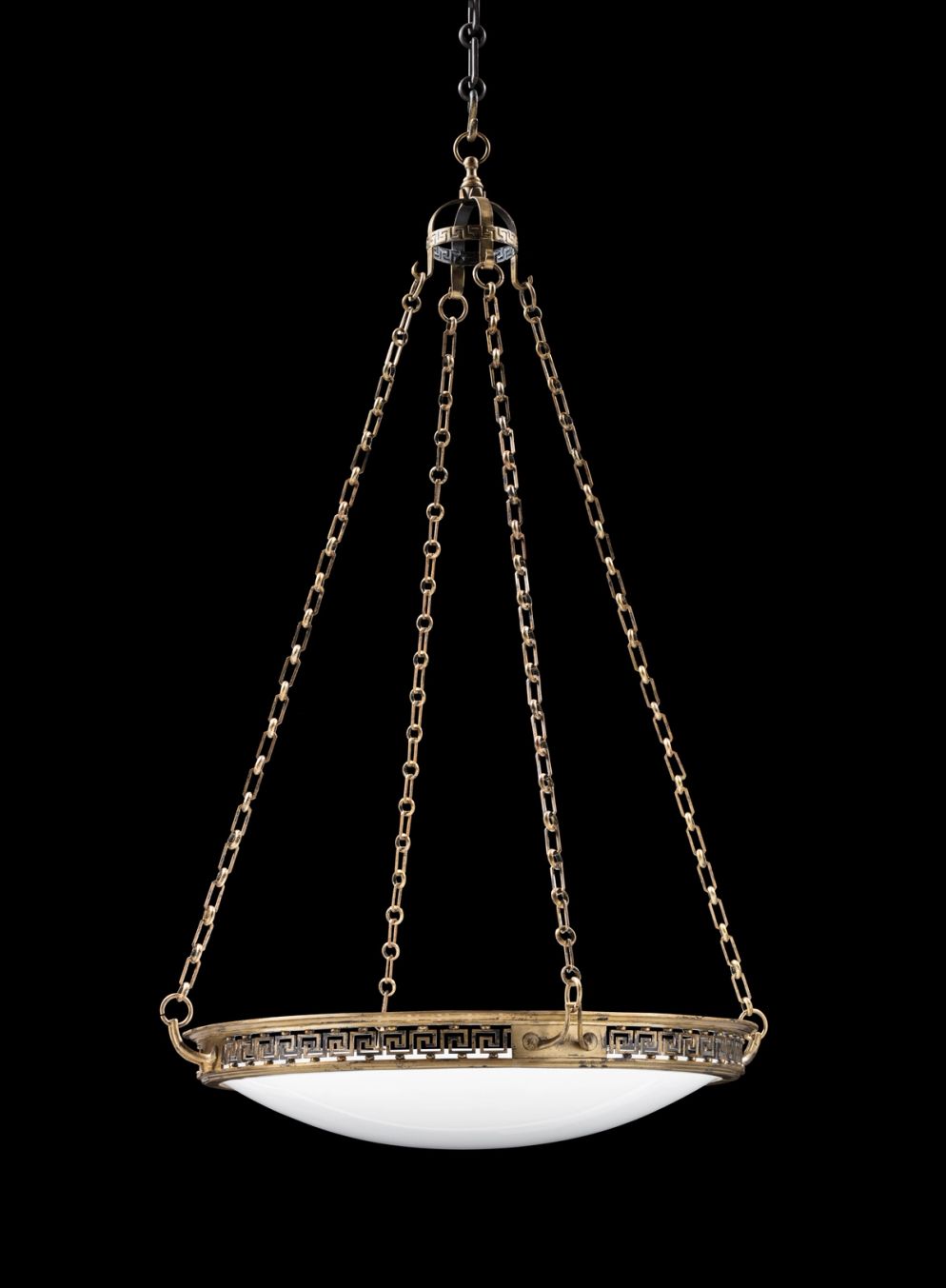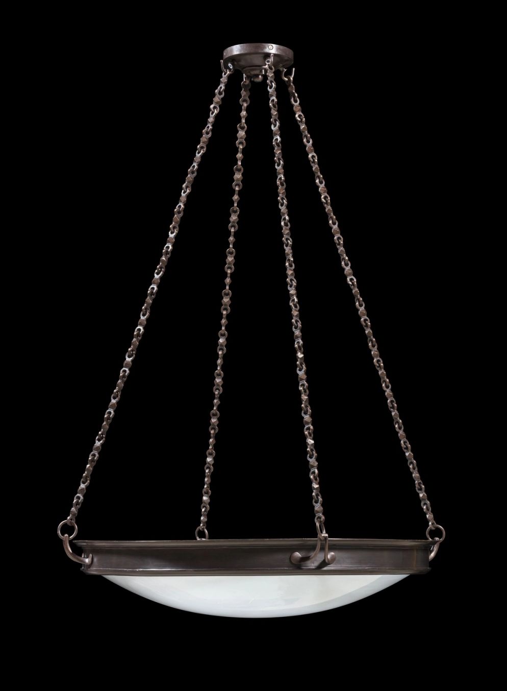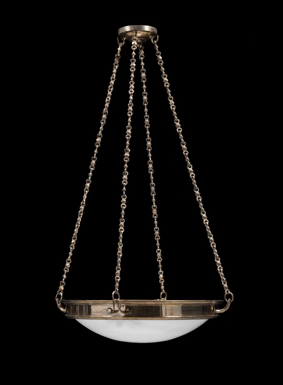 Suspended from three or four chains, Jamb dish lights in brass or with an opaline effect glass dish, range from small to grand in scale. The brass dish and handles of the Batsford recalls an ancient Roman tazza while the Atlas Dish light evokes Art Deco extravagance.