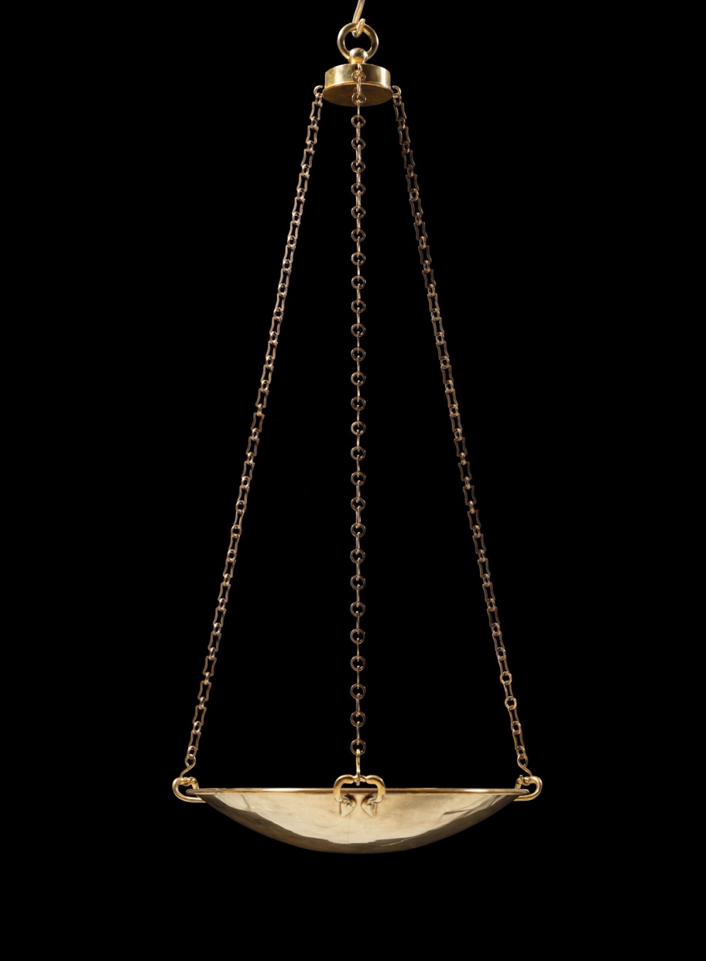 A refined and elegant shallow pendant dish light, suspended from three chains from a crown canopy, attached to slender bowed cast mouldings.