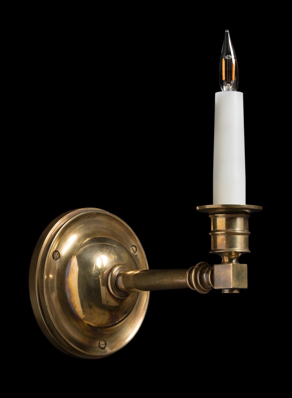 An elegant wall sconce, the Walter with French Candle is defined by its clarity of form and finely judged proportions. A circular backplate supports a turned brass stem, terminating in a square collar and a simply moulded candle holder. At its top sits a rarely seen French candle fitting - adding a note of refinement to the pared-back composition. With no unnecessary ornament, the Walter is confident in its restraint, equally suited to repetition along halls or as a singular punctuation.