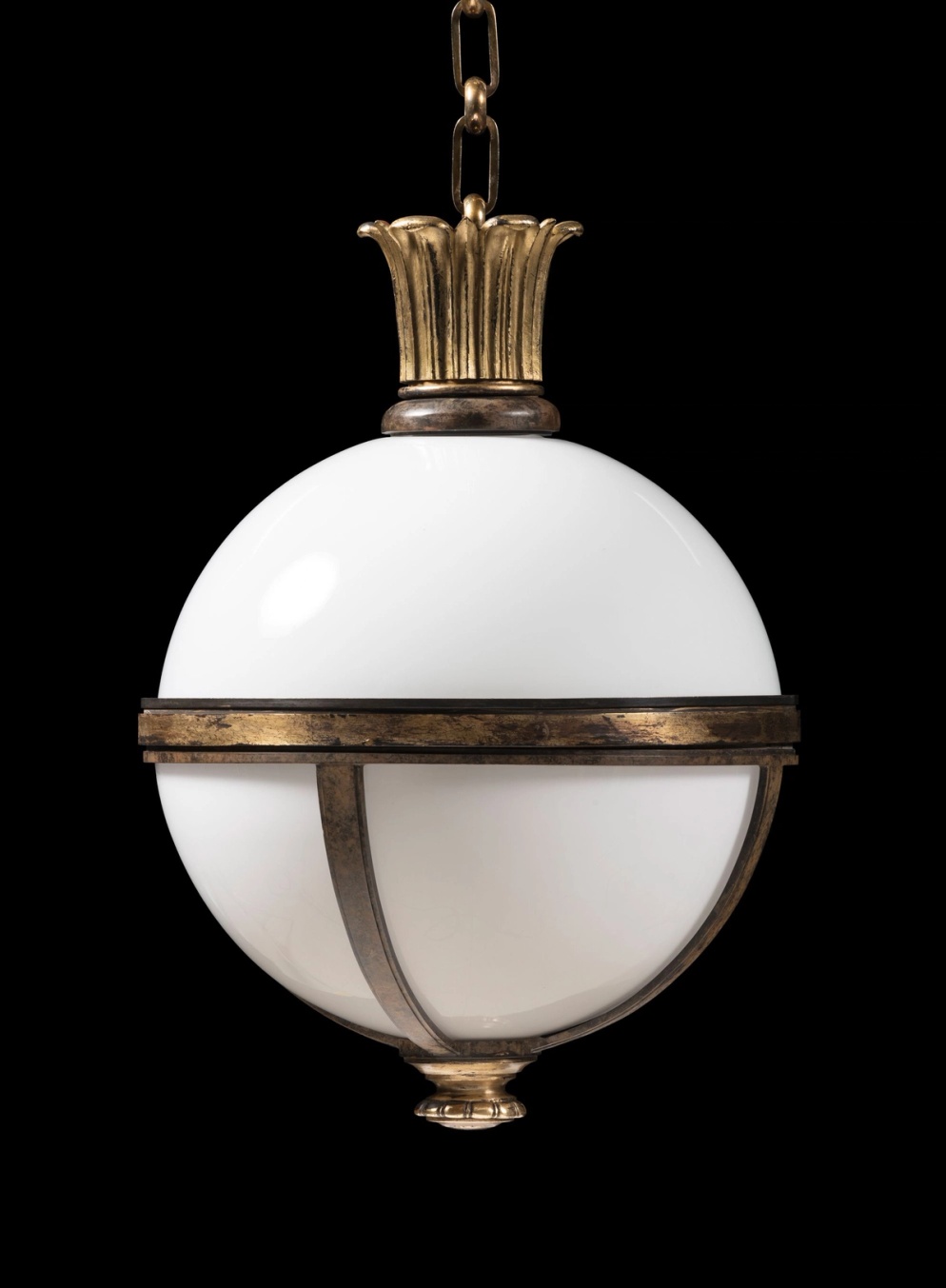 A tall crown of gilt feathers stands upon this globe lantern of opaline glass. This crown’s elongated form is a beautiful contrast against the clean upper hemisphere of glass which forms a pleasing dome. A brass band of distressed gilt runs about the centre of the globe and quarters the lower hemisphere.