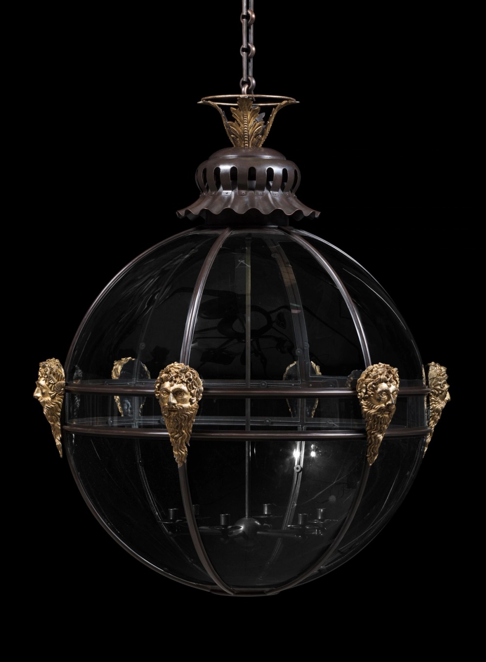 Made with hand-moulded copper and finished in bronze, this grand-scaled glazed spherical lantern is enriched with cast brass masks. The masks, with long beards, represent Neptune, the God of the Sea. The leaf-cast finial rests on a pierced cupola designed to reduce heat or smoke.