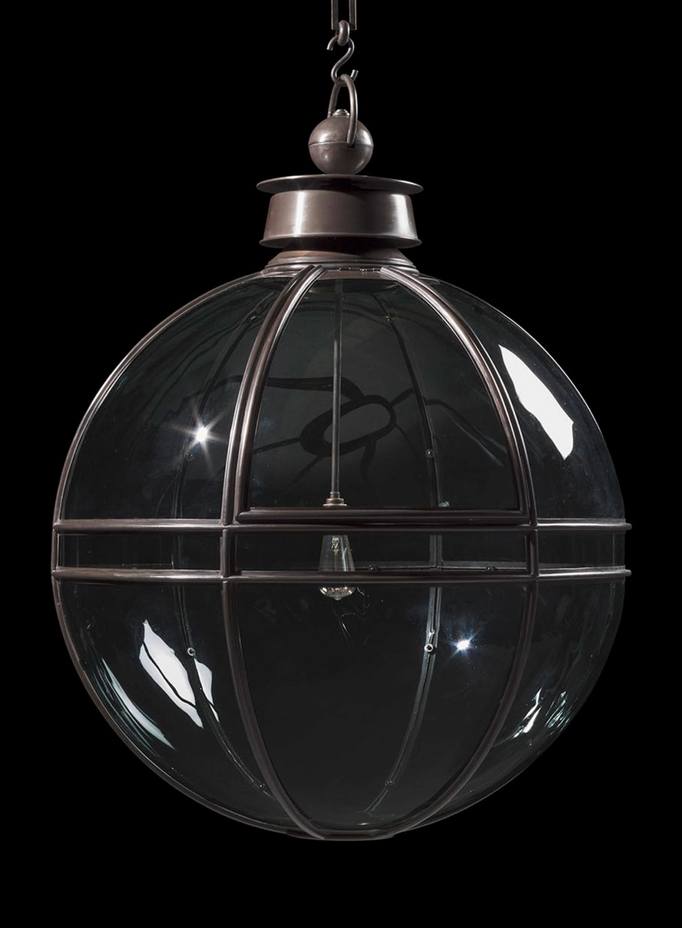This spherical lantern, now made to grand scale, is crafted of hand-moulded copper and finished in bronze. The central meridian of simple form, comprising of a double band moulding. A simple ball finial rests on a circular banded cupola designed to reduce heat or smoke.