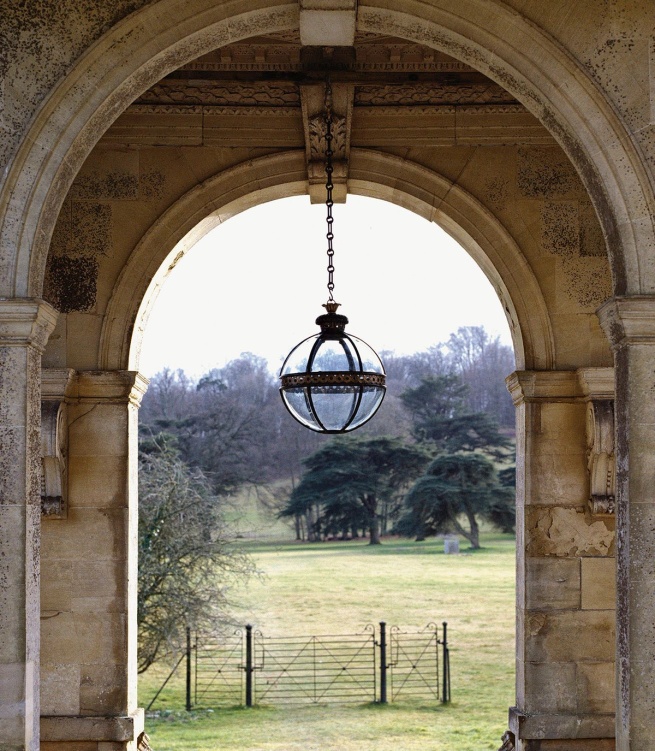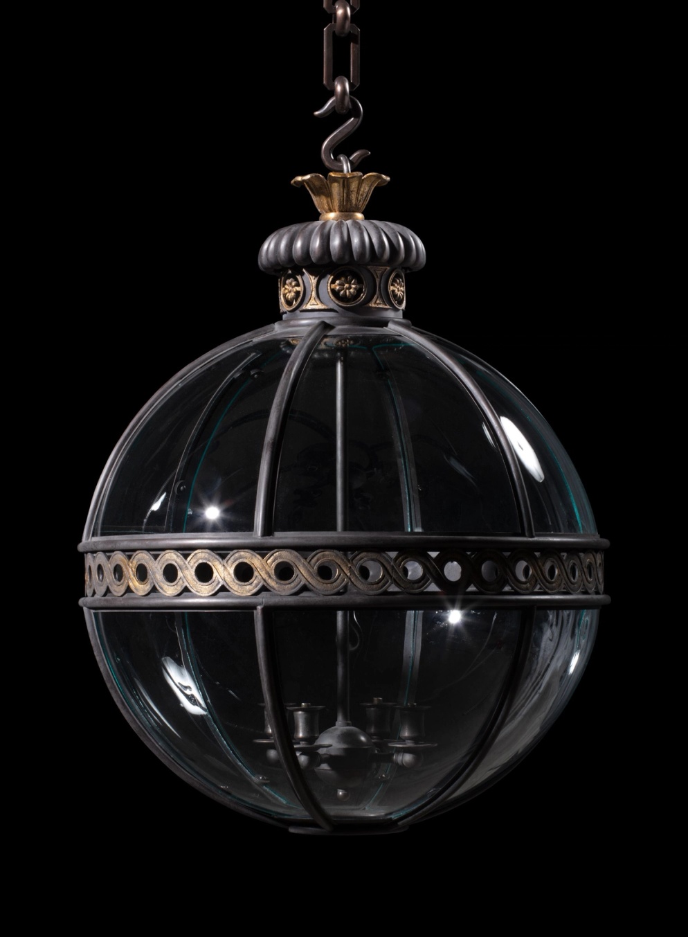 Each of the twelve glass panes sit within bronze mouldings divided by a meridian band of pierced gilt brass guilloche. The gadroon-moulded chimney with flower head filled, gilt brass guilloche sits beneath a leaf cast rose.