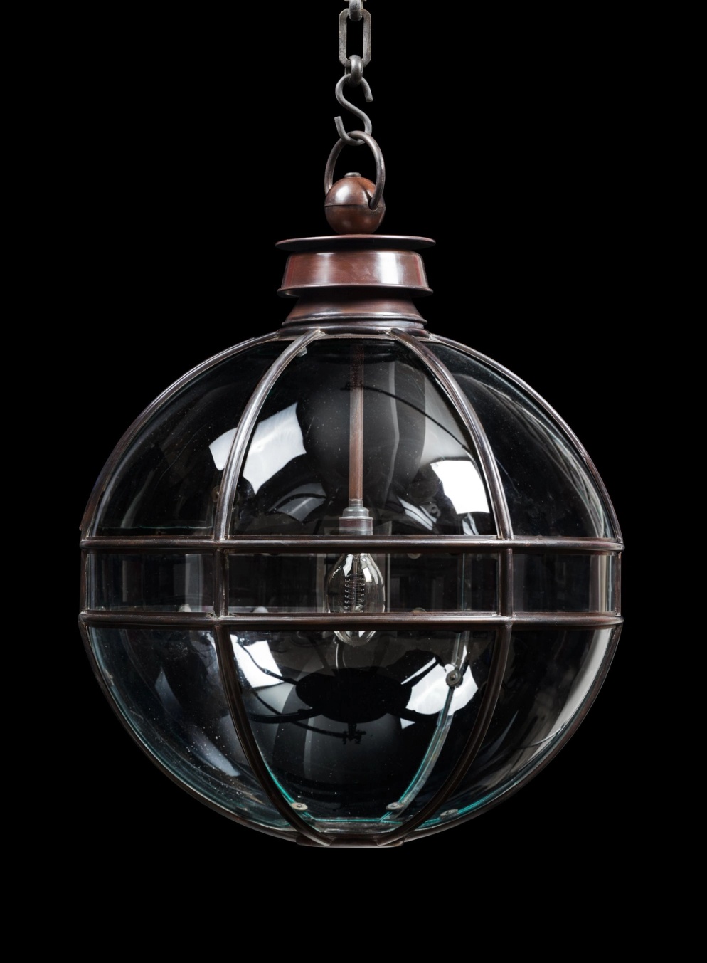 This large glazed, spherical lantern is made with hand-moulded copper and finished in brown bronze. The central meridian of simple form, comprising of a double band moulding. A simple ball finial rests on a circular banded cupola designed to reduce heat or smoke.