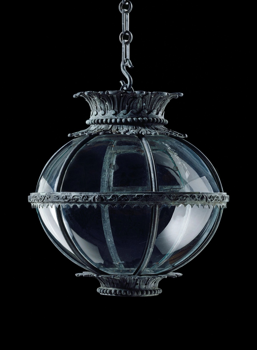 A bronze hanging lantern of squat circular form, with a central band decorated with flower heads and scrolling foliage. The top and bottom with bands of running pearl and acanthus decoration.